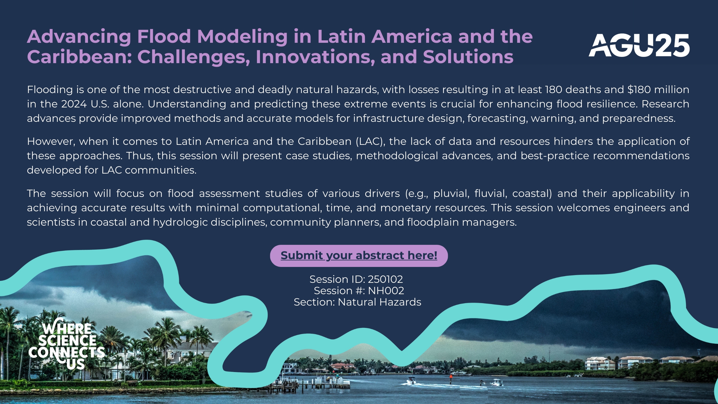 Engineers and scientists within the coastal and hydrologic discipline, community planners, and floodplain managers are invited to participate in the session NH002 – Advancing Flood Modeling in Latin America and the Caribbean: Challenges, Innovations, and Solutions